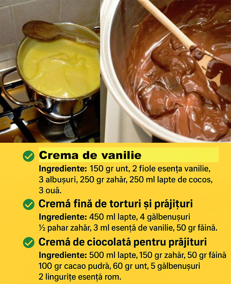 Ingrediente: 450 ml lapte, 4 gălbenușuri, ½ pahar zahăr, 3 ml esență de vanilie, 50 gr făină.