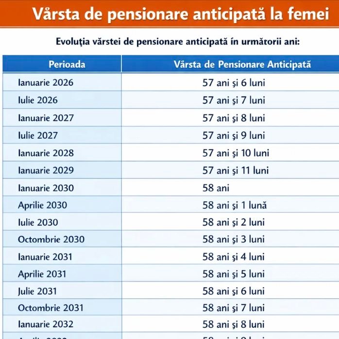 De exemplu, în ianuarie 2026, vârsta standard va fi de 62 de ani și 6 luni, iar femeile care au realizat un stagiu complet de 33 de ani și 3 luni vor putea ieși la pensie anticipat la 57 de ani și 6 luni.