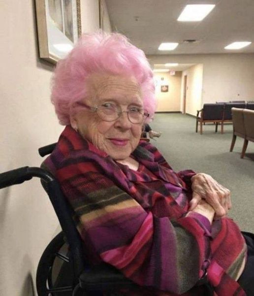 Fotografia a fost facuta de o tanara care a ramas fara cuvinte in momentul in care, pe holurile unui spital, a zarit o batranica cu parul roz, plina de viata, in ciuda varstei inaintate pe care o avea.