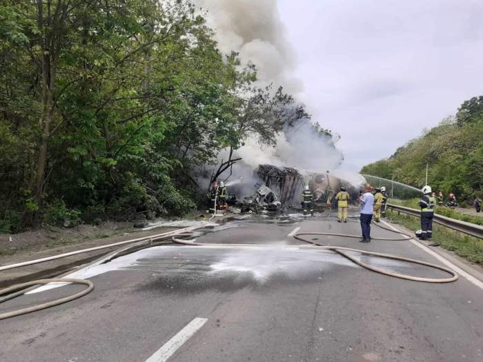 Persoana decedată ar fi șoferul autotrenului. Acesta transporta fier vechi. Accidentul s-a produs într-o zonă în apropiere de o cale ferată. La momentul în care au intervenit autoritățile, ambele autovehicule ardeau în totalitate.