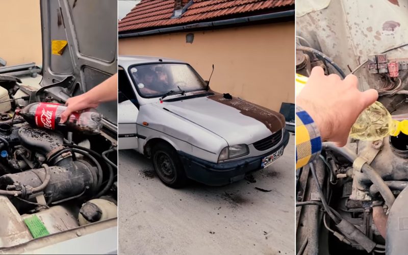 La un momendat, cel care filma a avut ideea sa introduca Coca-Cola in motor, dar chiar si asa motorul batranei masini s-a dovedit a fi indestructibil.