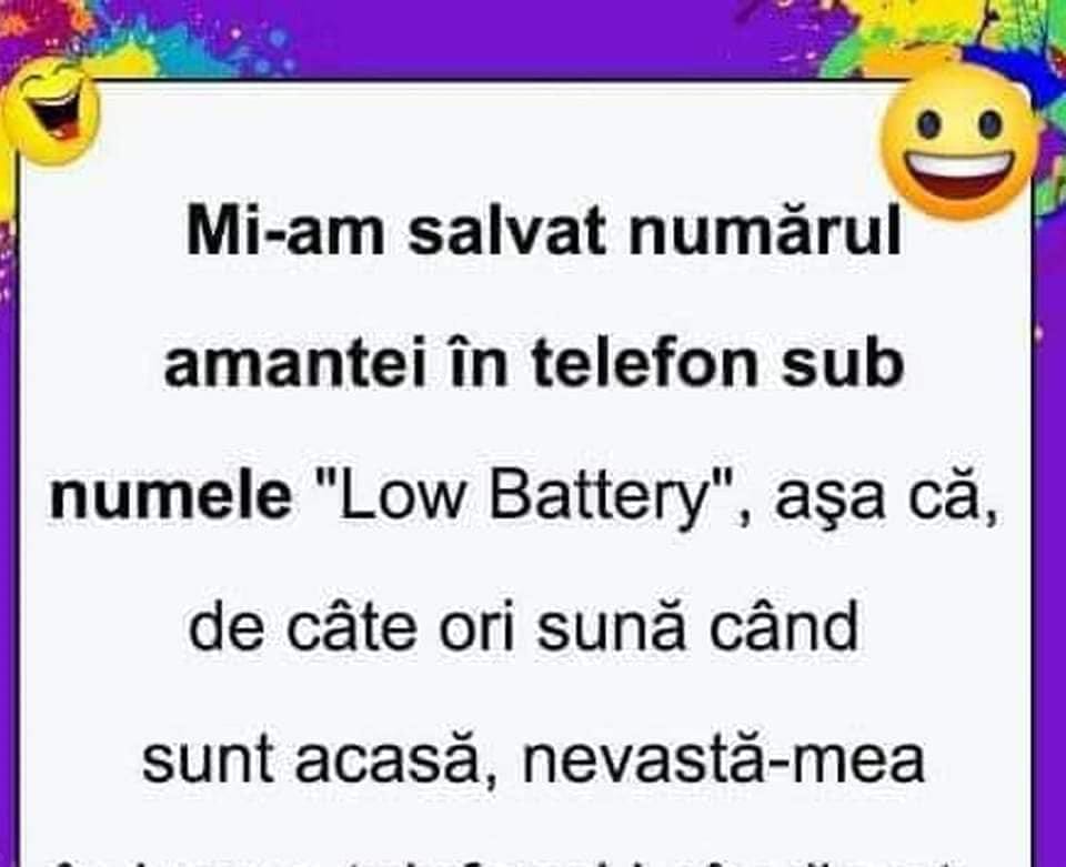 Mi-am salvat numărul amantei în telefon sub numele „Low Battery”, așa că, de câte ori sună când sunt acasă, nevastă-mea îmi pune telefonul la încărcat.