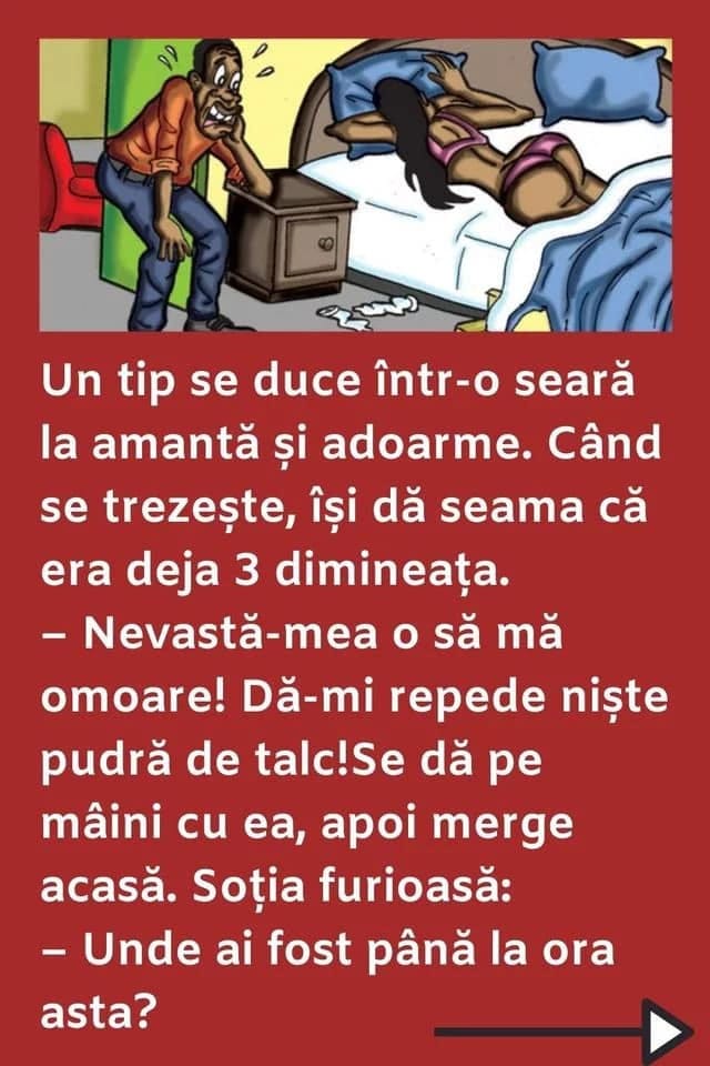 – Arată mâinile! Îi zice soţia şi vede că are mâinile pline de pudră de talc.