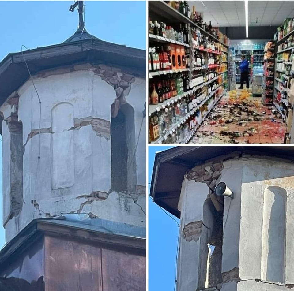 Turla bisericii din Arcani, judeţul Gorj, este în pericol de prăbuşire. În imagini se vede cum clădirea veche are fisuri mari, iar unele părţi din tencuială s-au desprins. În aceeaşi localitate, mai multe persoane au semnalat că au căzut ţigle de pe case. „Cel puţin 100 de ţigle mi-au căzut de pe casă”, a afirmat o femeie.