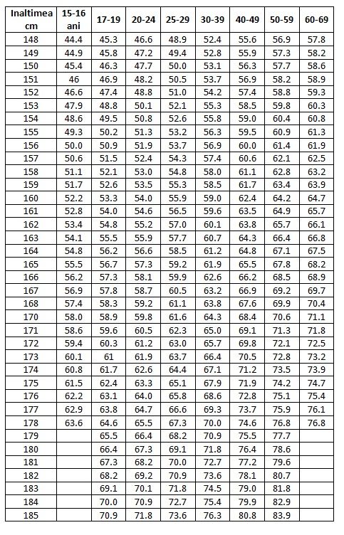 Urmatorul tabel te poate ajuta sa verifici greutatea ideala in functie de inaltime si varsta. Daca ai mai putine kilograme decat ar trebui, mergi la medic si vezi daca nu cumva ai o problema de sanatate. Dupa ce ai exclus aceasta posibilitate, poti incerca sa iti imbogatesti dieta cu nutrienti care te-ar putea ajuta sa te ingrasi.