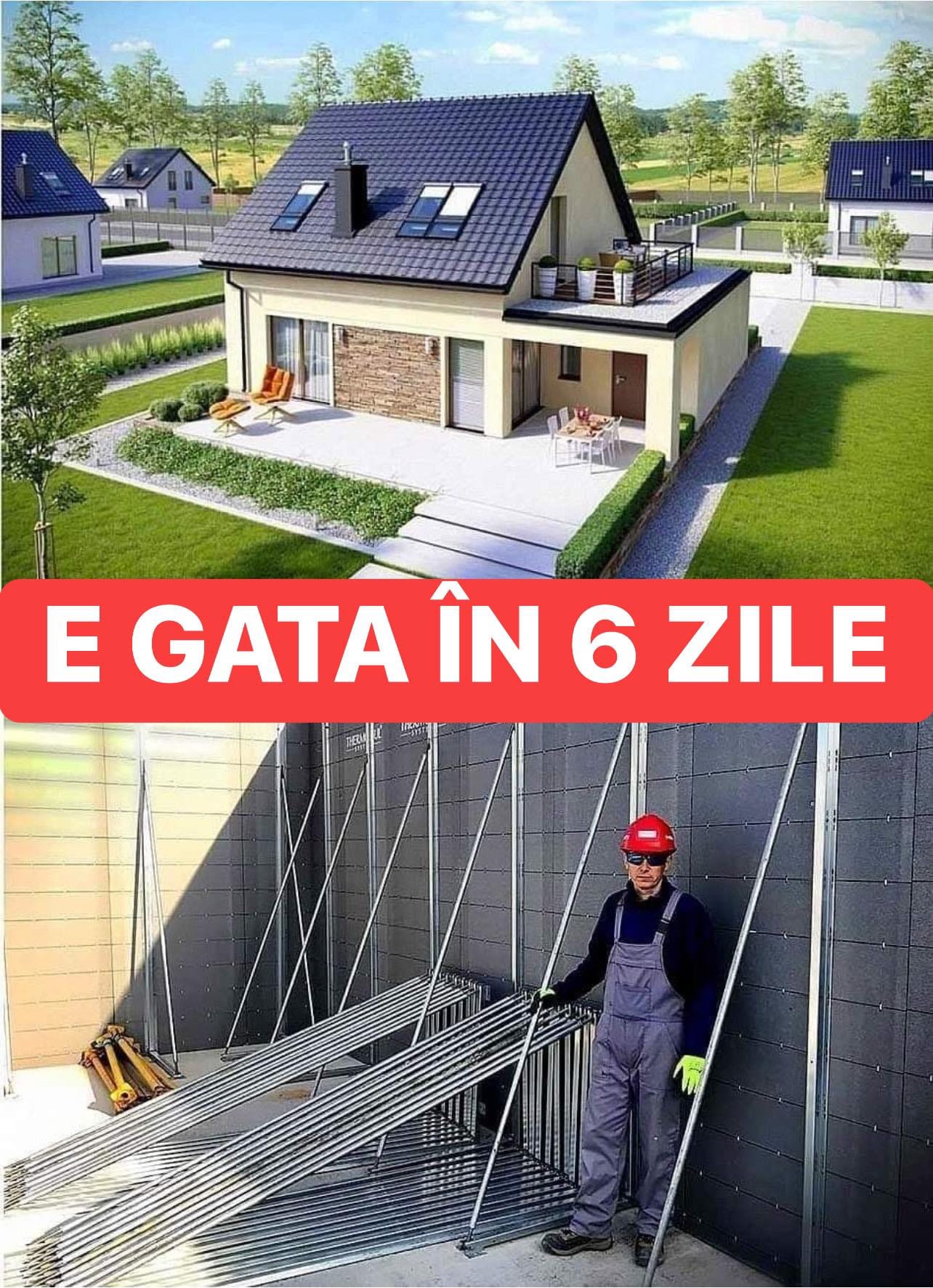 Totuși, compania menționează că, dacă sunteți foarte ambițioși, in doar 1 zi se poate monta intreaga structura pentru o casa de 150 m2, inclusiv planseul si se poate pregati faza doi de constructie, turnarea betonului.