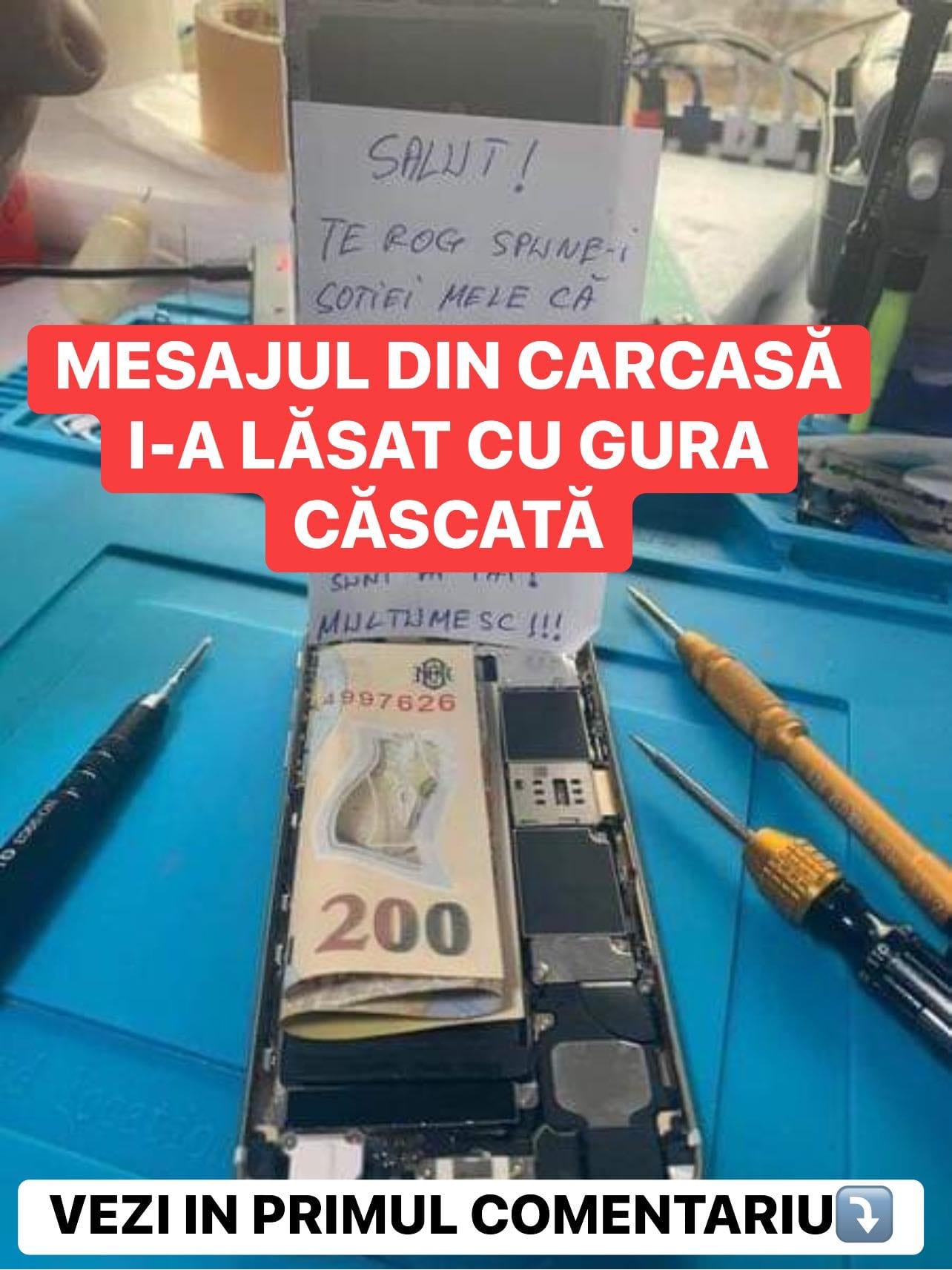 mele că nu se poate repara telefonul. Vrea să-mi verifice mesajele de pe Whatsapp.. Cei 200 de lei sunt ai tăi”, este mesajul transmis de proprietar pe un bileţel.