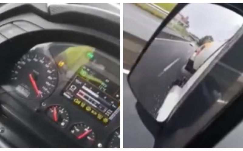 Un șofer profesionist a fost suprins circulând cu peste 120 la oră pe autostradă cu o cisternă încărcată cu cu 27 de tone de combustibil. Şoferul e fericit şi filmează în timp ce apasă la podea aceleraţia: „Lume, lume!”, strigă el.