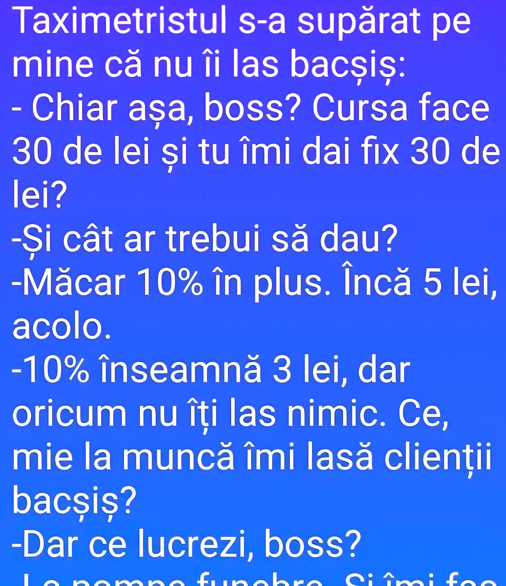 -Chiar așa, boss? Cursa face 30 de lei și tu îmi dai fix 30 de lei?
