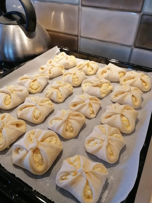 Foloseste-ti mainile pentru a intinde fiecare bila crescuta intr-o clatita subtire. Puneti putina umplutura de branza in mijloc si inchideti-o intr-un aluat legand doua colturi opuse. Procesati toate partile din aluat si umplutura in acest fel. Aranjati esarfele finite una langa alta pe o foaie de copt acoperita cu hartie de copt, acoperiti-le din nou cu un prosop si lasati-le sa creasca inca 20 de minute.