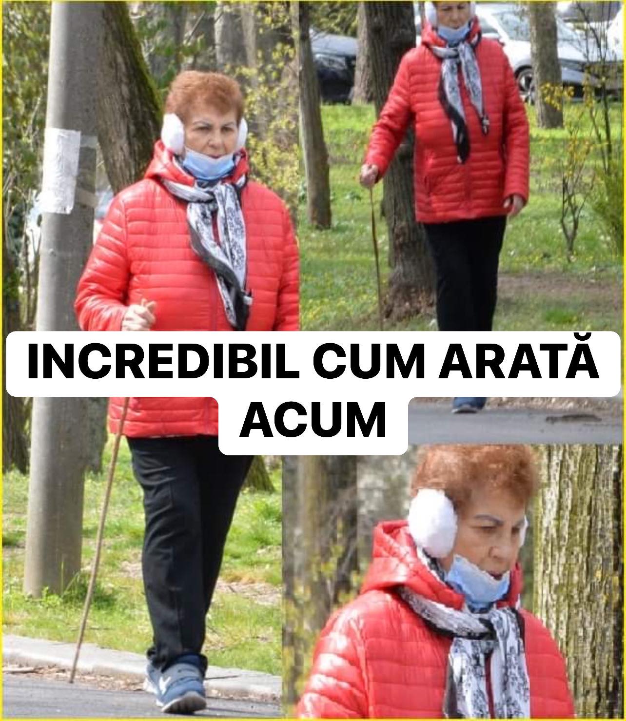 Îmbrăcată cu o pereche de pantaloni negri, lejeri, geacă roșie, și încălțată cu adidași, Irina Loghin și-a luat căști de protecție împotriva frigului și vântului, eșarfă și mască de protecție, dar și un băț pe post de baston, probabil, și a luat la picior aleea principală a parcului.