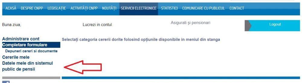 Odată intrat în cont, vei avea la dispoziție un meniu în partea stângă a paginii. În meniu, selectezi „Datele mele din sistemul public de pensii”.