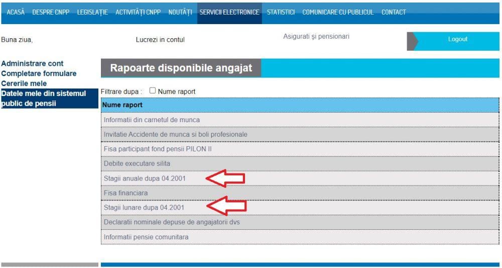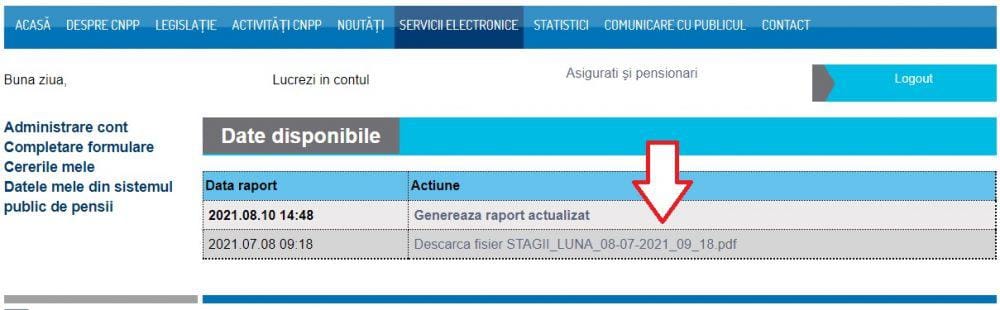 În acea secțiune, poți alege fie un document cu stagiile lunare de cotizare înregistrate în evidențele CNPP începând cu aprilie 2001, fie un document cu stagiile anuale de cotizare. Intri pe stagii lunare sau pe stagii anuale și apoi apeși pe „Generează raport actualizat”.
