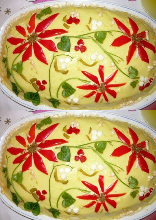 Dupa toti acesti pasi, preparati maioneza din galbenus, mustar, zeama de lamaie, sare, piper si ulei si asezati-o peste salata.