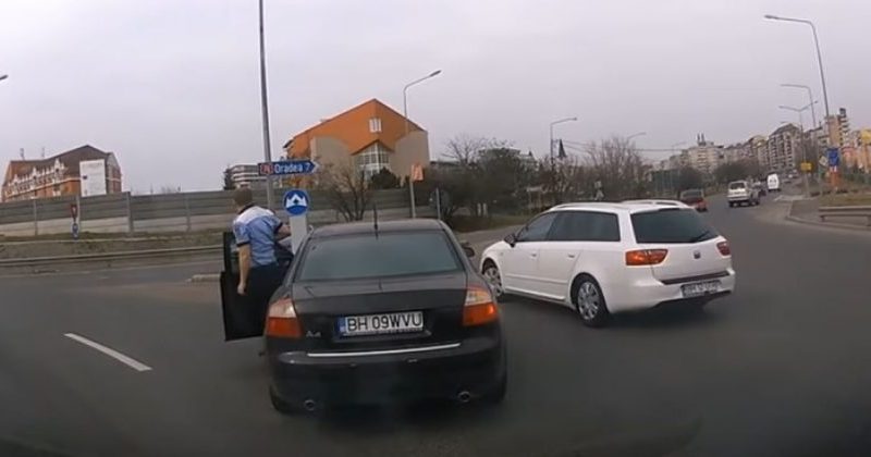 O cameră de bord a surprins recent un incident petrecut într-un sens giratoriu de pe centura Municipiului Oradea. Un șofer a fost tras pe dreapta și amendat de un polițist într-o mașină fără inscripția MAI, căruia i-a tăiat calea. Cei care au vizionat imaginile au păreri împărțite. A procedat corect polițistul sau nu? VIDEO la finalul textului.Potrivit Știrilor Pro TV, un șofer aflat la volanul unui Seat de culoare albă, a înconjurat giratoriul pe banda exterioară și a tăiat calea unui autoturism Audi care a virat dreapta să iasă din intersecție.Din Audi a coborât un polițist în uniformă, care i-a aplicat șoferului din Seat o sancțiune constând în 6 puncte amendă și 870 de lei pentru ”neîncadrarea corespunzătoare în sensul giratoriu în vederea efectuării virajului la stânga”.Mulți dintre cei care au vizionat filmarea de mai jos susțin că polițistul a greșit:– Politistul trebuia sa se incadreze cu vreo minim 10 metri inainte pe cealalta banda nu cand e exact in dreptul ei.– De pe banda 2 nu am mai văzut sa faci la dreapta– Trebuia sa se încadreze din timp pe banda 1– legislatia rutiera spune clar, la schimbarea directiei de mers te asiguri sì dai prioritateVIDEO Momentul în care polițistul consideră că șoferul a greșit: