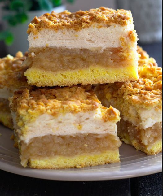 Asezam merele peste compozitia cu galbenusuri, le nivelam. Apoi adaugam peste mere aluatul cu albusuri. Deasupra, dati re razatoare restul de aluat de galbenusuri.