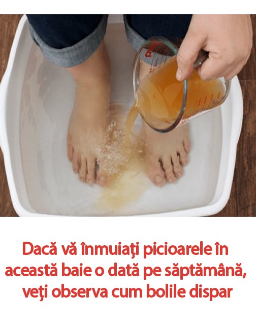 Se adaugă 1-2 cești de oțet de mere în cada cu apă fierbinte sau într-un lighean mai mare pentru picioare, și amestecați bine apa. Baia cu oțet de mere poate dura cam 30 de minute.