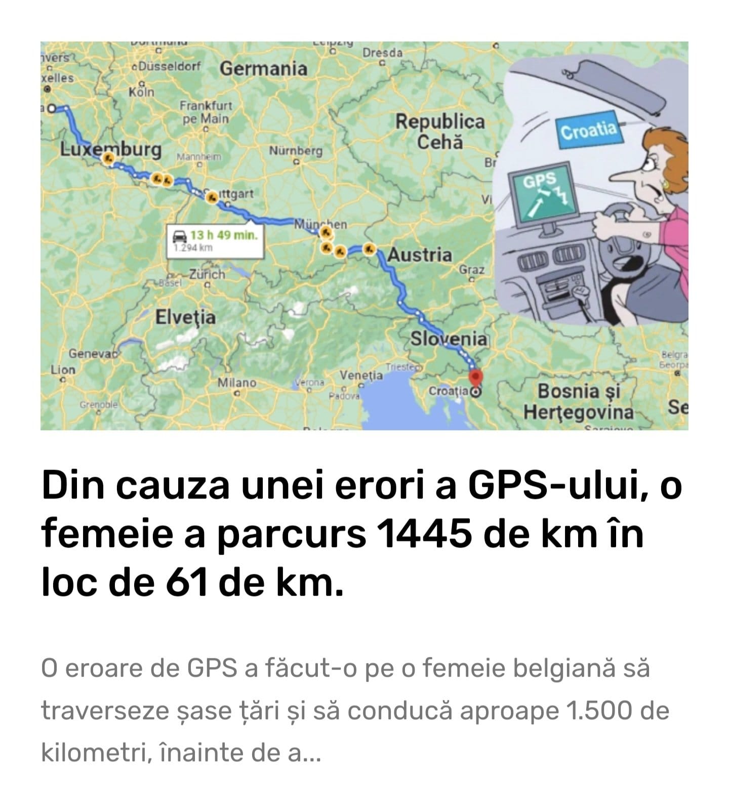O eroare de GPS a făcut-o pe o femeie belgiană să traverseze șase țări și să conducă aproape 1.500 de kilometri, înainte de a observa că sistemul de navigație al mașinii defectuos.