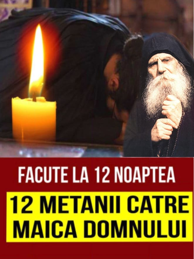 12 metanii catre Maica Domnului. Marele duhovnic Paisie Olaru spunea atat ca „orice rugaciunea este dar de la Dumnezeu”, iar daca vrem ca Dumnezeu sa ne indeplineasca toate dorintele trebuie sa citim dimineata Acatistul Maicii Domnului, iar seara Paraclisul Fecioarei, crezul, neaparat o data pe zi, iar Psalmul 50, de cate ori putem.