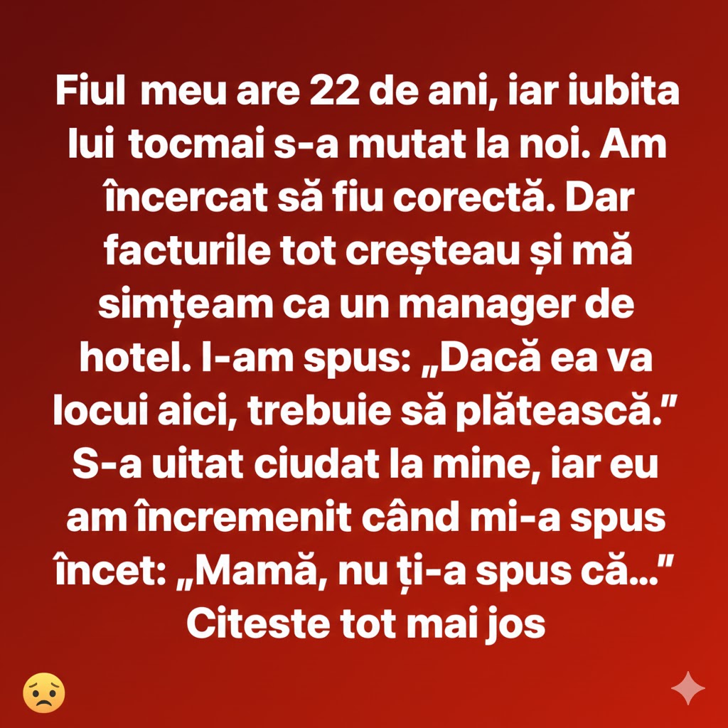 Fiul meu avea doar 22 de ani când prietena lui s-a mutat în casa noastră. Am încercat să rămân deschisă la minte, dar pe măsură ce facturile creșteau și coșul de cumpărături se umplea mai repede ca de obicei, am început să mă simt mai mult ca un proprietar decât ca o mamă.