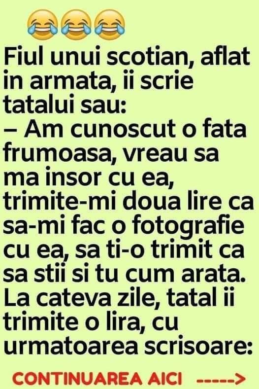 – Am cunoscut o fata frumoasa, vreau sa ma insor cu ea, trimite-mi doua lire ca sa-mi fac o fotografie cu ea, sa ti-o trimit ca sa stii si tu cum arata.
