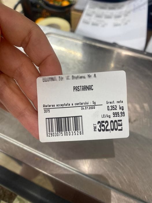 După ce a cântărit leguma, femeia a văzut pe etichetă că are de plătit 352 de lei pentru 353 de grame de păstârnac. Asta înseamnă că 1 kilogram de păstârnac se vinde cu suma incredibilă de 1.000 de lei.