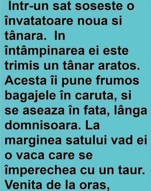 Acesta îi pune frumos bagajele în căruţă, şi se aşează în faţă, lângă domnişoară. La marginea satului văd ei o vacă care se împerechea cu un taur. Venită de la oraş, învăţătoarea este profund marcată şi-l întreabă pe tânăr: