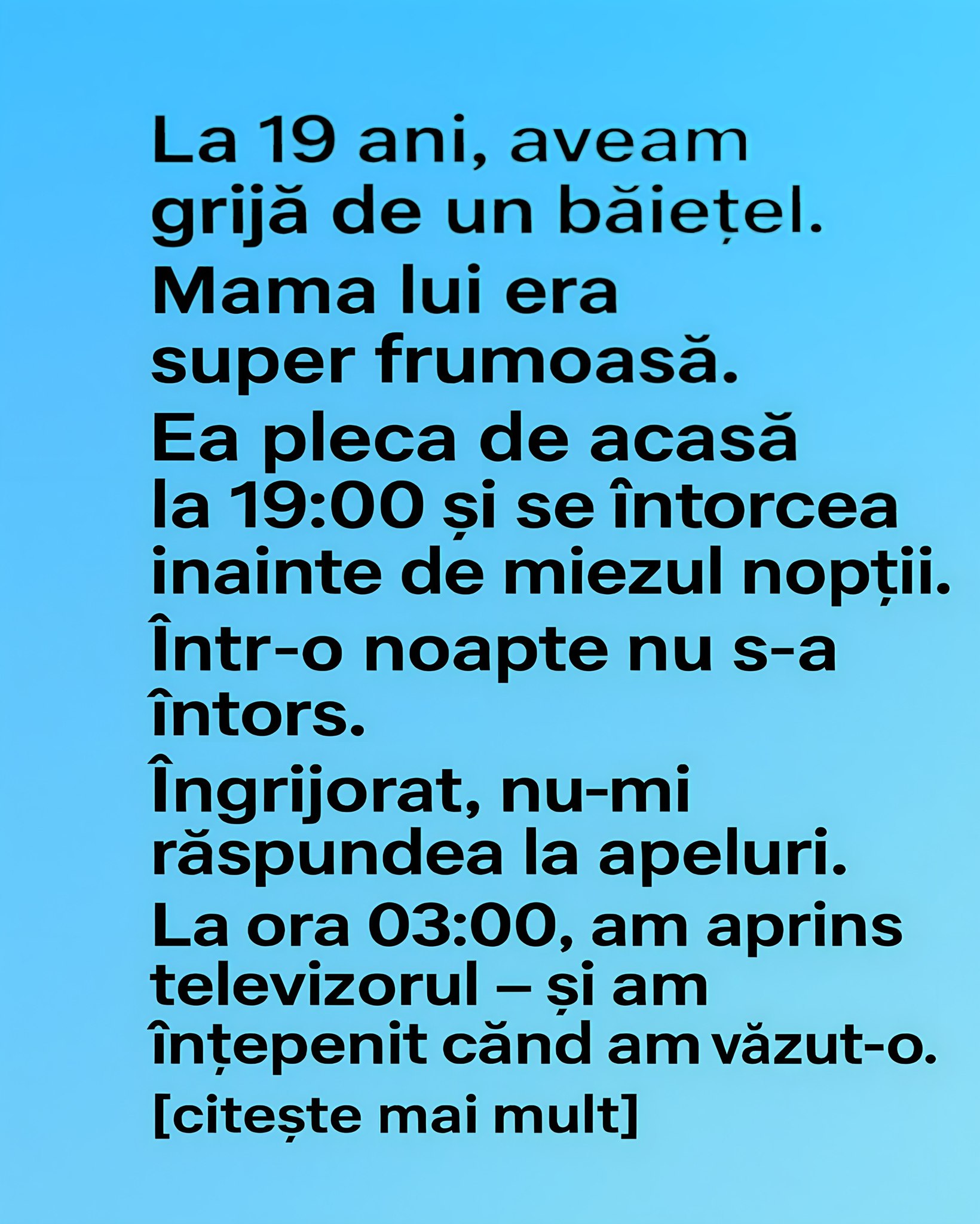 Aveam 19 ani când o îngrijeam pe Dorian, un băiețel de câțiva ani, cuminte și mereu cu girafa lui de pluș în brațe. Mama lui, Mirela, era una dintre cele mai elegante și misterioase femei pe care le cunoscusem. Pleca în fiecare seară la ora 19:00, impecabil aranjată, și se întorcea înainte de miezul nopții. Nu știam niciodată unde merge, iar ea nu simțea nevoia să explice.