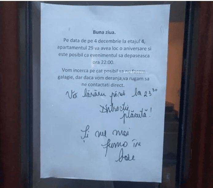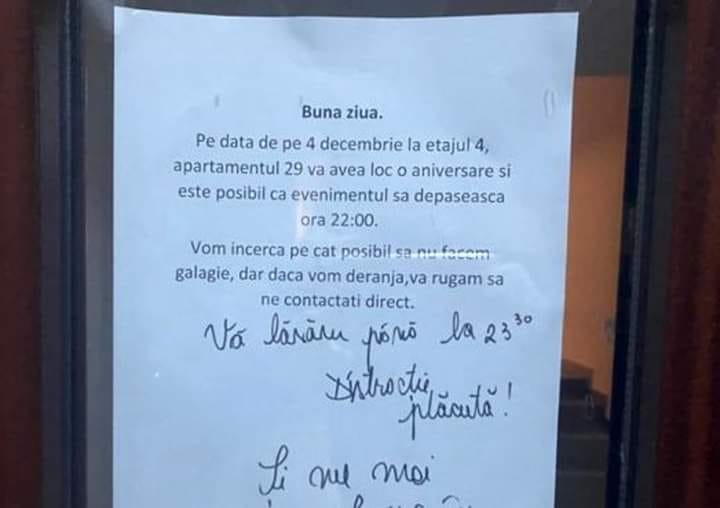 ”Bună ziua. Pe data de pe 4 decembrie, la etajul 4, apartamentul 29, va avea loc o aniversare și este posibil ca evenimentul să depășească ora 22:00. Vom încerca pe cât posibil să nu facem gălăgie, dar dacă vom deranja, vă rugăm să ne contactați direct”, este anunțul locatarului.