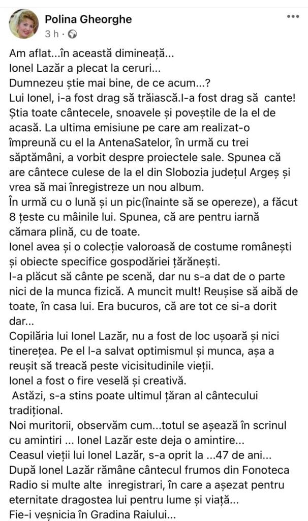 Ionel Lazăr, unul dintre cei mai valoroși artiști de muzică populară, a murit. Artistul se lupta de mult timp cu o boală grea si ultimele luni din viață au fost un chin pentru el. Slăbise foarte mult și era de nerecunoscut, dar spera că va învinge cancerul.