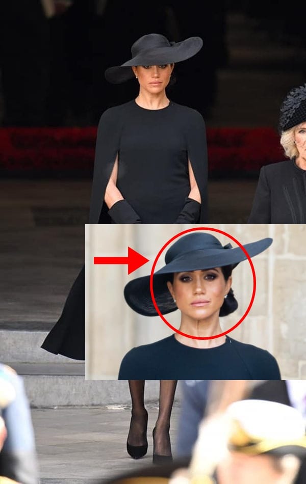 Soția lui Harry a purtat o ținută tradițională complet neagră și o pălărie care îi acoperea privirea.