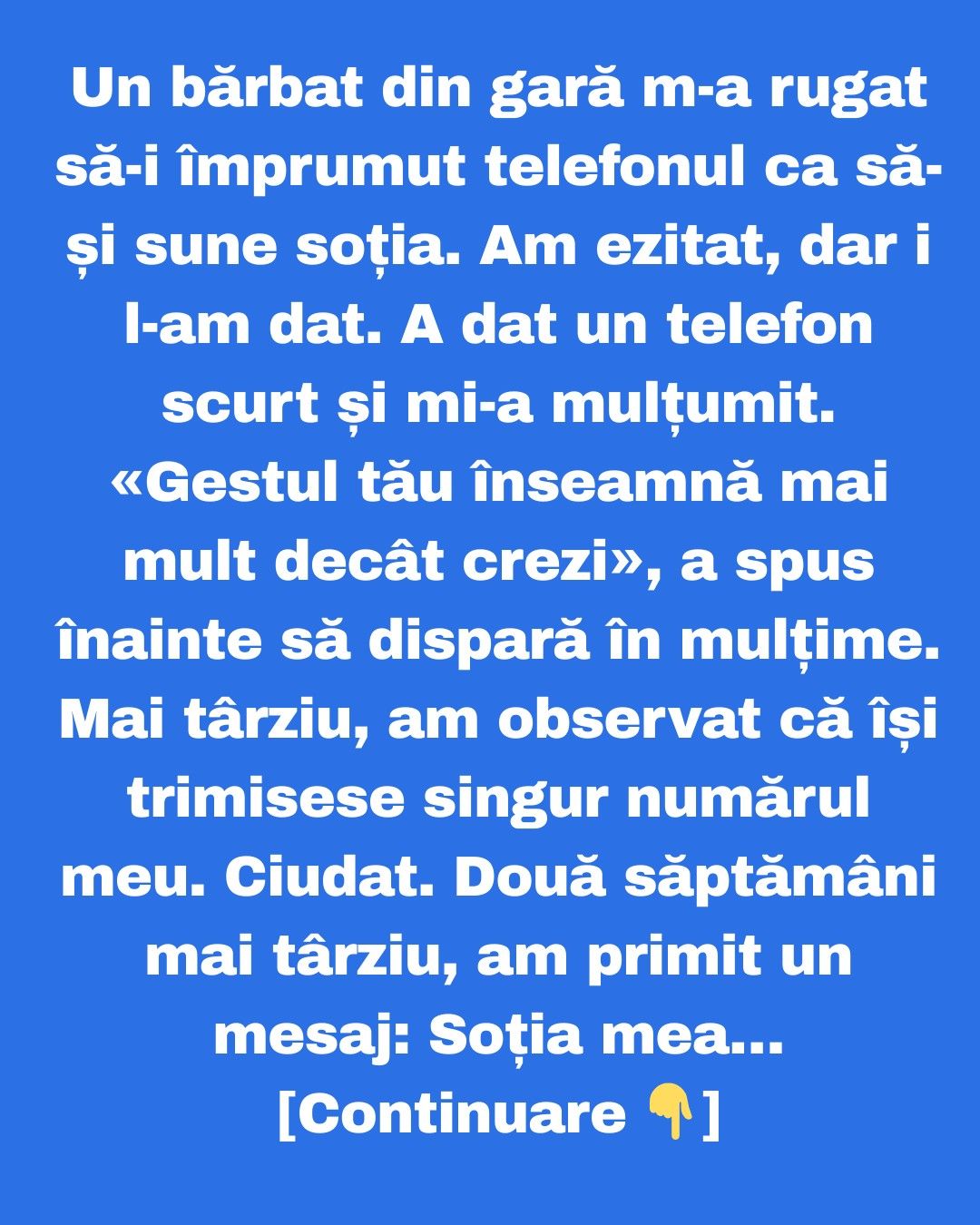 M-a întrebat, cu o voce încordată, dacă poate folosi telefonul meu pentru a-și suna soția, spunând că al lui se descărcase complet. Am ezitat, pentru că de regulă nu ofer telefonul unor necunoscuți, dar disperarea din privirea lui și prezența polițiștilor în gară m-au făcut să accept.