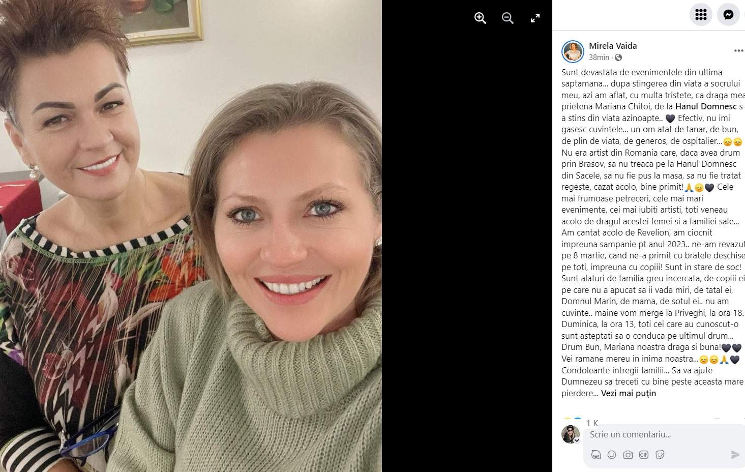 ”Sunt devastata de evenimentele din ultima saptamana… dupa stingerea din viata a socrului meu, azi am aflat, cu multa tristete, ca draga mea prietena Mariana Chitoi, de la Hanul Domnesc s-a stins din viata azinoapte.. Efectiv, nu imi gasesc cuvintele… un om atat de tanar, de bun, de plin de viata, de generos, de ospitalier… Nu era artist din Romania care, daca avea drum prin Brasov, sa nu treaca pe la Hanul Domnesc din Sacele, sa nu fie pus la masa, sa nu fie tratat regeste, cazat acolo, bine primit! Cele mai frumoase petreceri, cele mai mari evenimente, cei mai iubiti artisti, toti veneau acolo de dragul acestei femei si a familiei sale… Am cantat acolo de Revelion, am ciocnit impreuna sampanie pt anul 2023.. ne-am revazut pe 8 martie, cand ne-a primit cu bratele deschise pe toti, impreuna cu copiii! Sunt in stare de soc! Sunt alaturi de familia greu incercata, de copiii ei pe care nu a apucat sa ii vada miri, de tatal ei, Domnul Marin, de mama, de sotul ei.. nu am cuvinte.. maine vom merge la Priveghi, la ora 18. Duminica, la ora 13, toti cei care au cunoscut-o sunt asteptati sa o conduca pe ultimul drum… Drum Bun, Mariana noastra draga si buna! Vei ramane mereu in inima noastra… Condoleante intregii familii… Sa va ajute Dumnezeu sa treceti cu bine peste aceasta mare pierdere…”, a fost mesajul scrie de Mirela Vaida pe rețelele de socializare, în descrierea unei fotografii în care apare alături de prietena sa.