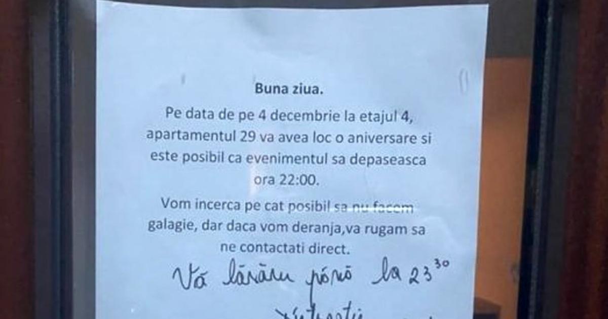 „Bună ziua. Pe data de pe 4 decembrie, la etajul 4, apartamentul 29, va avea loc o aniversare și este posibil ca evenimentul să depășească ora 22:00. Vom încerca pe cât posibil să nu facem gălăgie, dar dacă vom deranja, vă rugăm să ne contactați direct”.