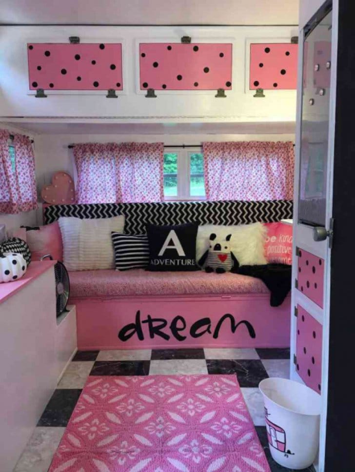 Asadar, americanca a cumparat o rabla de rulota cu numai 200 de dolari si a investit in renovare o suma dubla. A adus in interior aerului anilor ’70, in culori vii.
