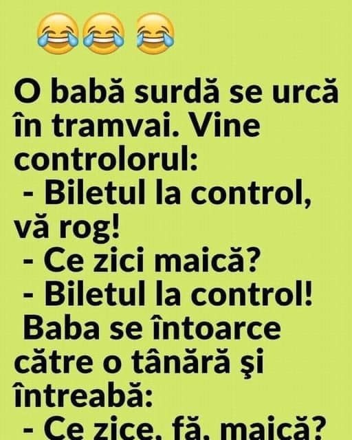 O babă surdă se urcă în tramvai. Vine controlorul: