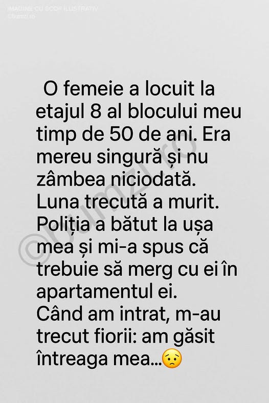 Am simțit cum mi se strânge inima. Nu știam dacă să plâng sau să mă simt vinovat. Nu o invitasem niciodată la o cafea, nu o întrebasem dacă are nevoie de ceva. De fiecare dată când o vedeam pe scară, mă grăbeam să-i spun doar un „bună ziua” scurt, poate chiar rece.