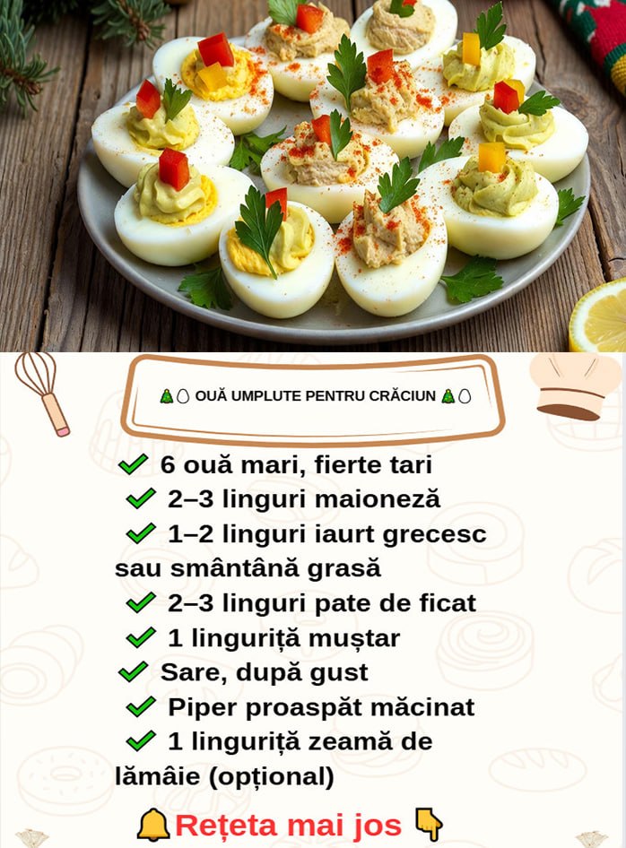 Mai jos gasesti o reteta de oua umplute pentru Craciun, explicata pas cu pas, cu o crema fina din galbenusuri,
