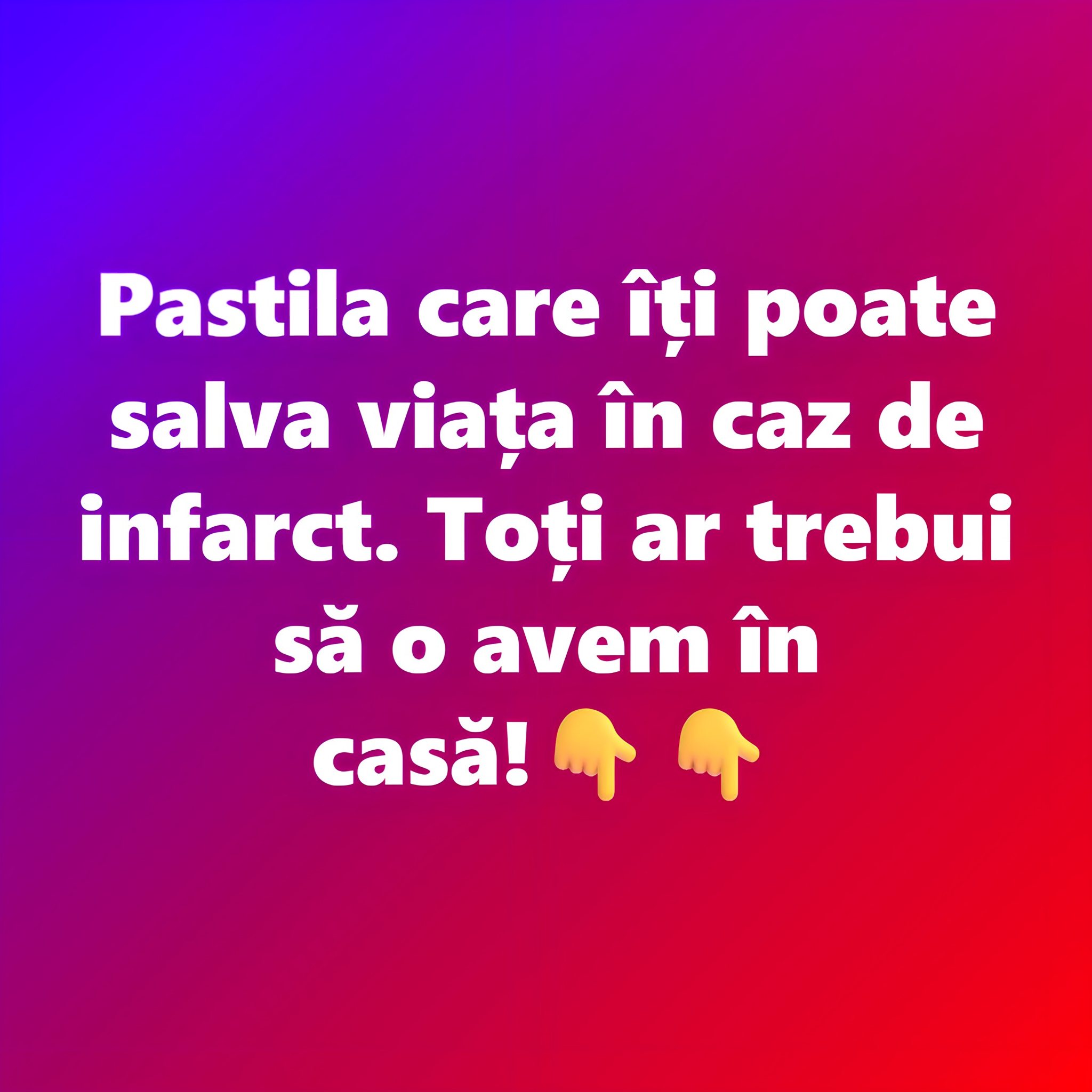 1) Doza: ia o doză de aproximativ 250–300 mg de aspirină (forma pentru adulți). Dacă ai doar comprimate cu altă concentrație, urmărește să te încadrezi în această plajă de doză.