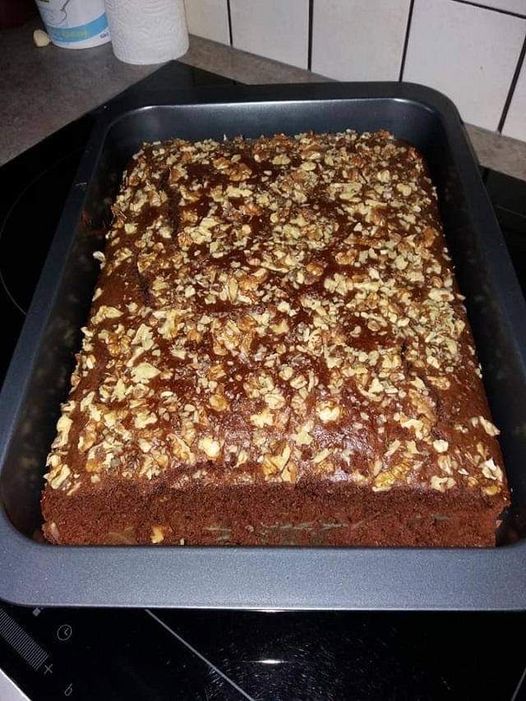 Toarnă compoziția într-o tavă de aproximativ 20 x 30 cm, tapetată cu hârtie de copt. Introdu tava în cuptorul preîncălzit la 180°C și coace prăjitura timp de 25-30 de minute. Verifică dacă este gata folosind o scobitoare; dacă iese curată, prăjitura este coaptă. - Toppingul de nucă