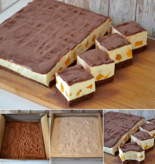 - Adăugați bucățile de piersici feliate, amestecați bine și întindeți crema pe suprafața blatului copt și răcit, care a fost însiropat ușor cu ceai sau lapte rece în prealabil.
