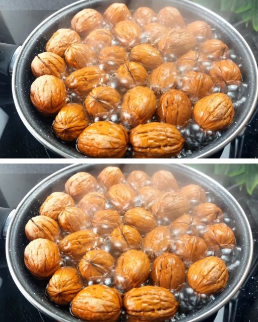 Într-un vas mic, așezăm nucile cu coajă și le acoperim cu apă. Punem vasul pe foc și lăsăm nucile să fiarbă timp de aproximativ 10 minute. După ce a trecut timpul, scoatem nucile din apa fierbinte și le descojim pentru a dezvălui miezurile valoroase. Nu uităm să separăm aproximativ 6 nuci pentru decorul final.