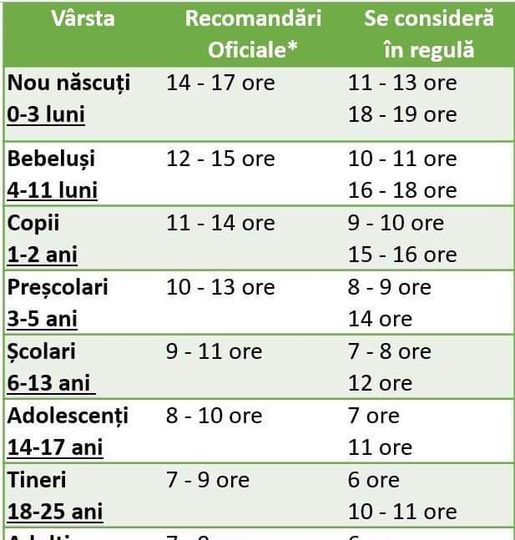 Adolescenți (14-17 ani): Adolescenții se confruntă adesea cu programul lor de somn perturbat de schimbările hormonale și de obiceiurile de viață. Aceștia ar trebui să doarmă între 8 și 10 ore pe noapte.