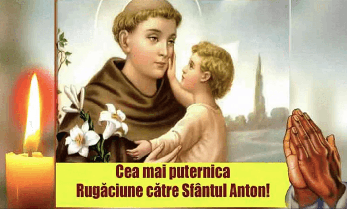 ”Mărite Sfinte Antoane, multe minuni şi haruri ai împărţit celor ce aleargă cu credinţă vie la tine, la şirul acesta neîntrerupt, mai adaugă încă unul şi pentru mine. Dă-mi harul unei credinţe vii, al unei nădejdi neclintite şi al unei iubiri aprinse către Dumnezeu, că să mă feresc pururea de moartea păcatului şi să-mi păstrez pururea viaţa binecuvântată a harului aici pe pământ, că să ajung la viaţa cea nesfârşită în cer.”