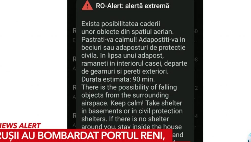 “Există posibilitatea căderii unor obiecte din spaţiul aerian. Păstraţi-vă calmul! Adăpostiţi-vă în beciuri sau adăposturi de protecţie civilă. În lipsa unui adăpost, rămâneţi în interiorul casei, departe de geamuri şi pereţi exteriori. Durata estimată: 90 de minute”, a fost mesajul RO-Alert primit de români.