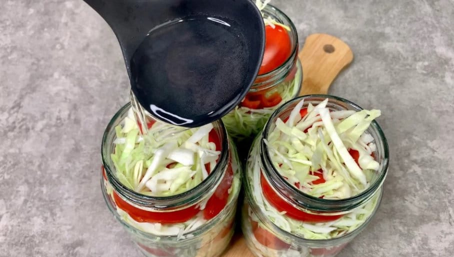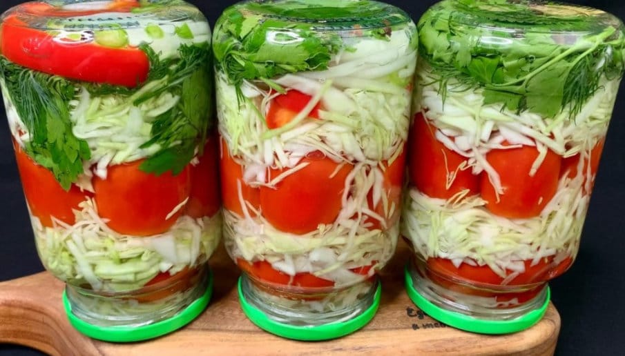 Punem rosii, varza, ardei dulce si iute, ceapa, marar si patrunjel in straturi in borcane.
