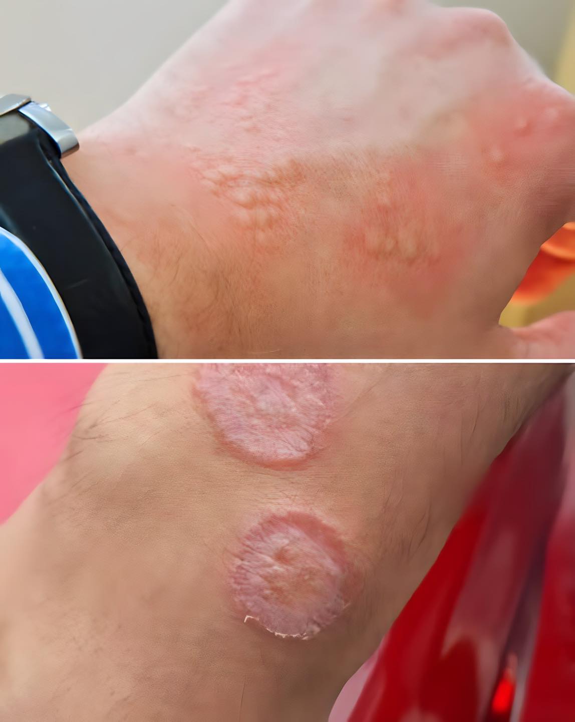 Cum arată și ce simți: grupuri de mici umflături roșii, adesea cu vârf pustulos, dispuse în jurul foliculilor; prurit, senzație de arsură sau sensibilitate; leziunile pot forma cruste pe măsură ce se vindecă.
