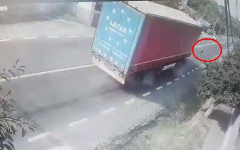 În clipul video de poate vedea cu șoferul camionului trage de volan, intră pe contrasens, evită la milimetru pietonul, dar intră în gardul unei gospodării pe care-l distruge. Reușește să evite o tragedie în timp ce bătrâna care scapă cu viață ca prin urechile acului își vede de drum.