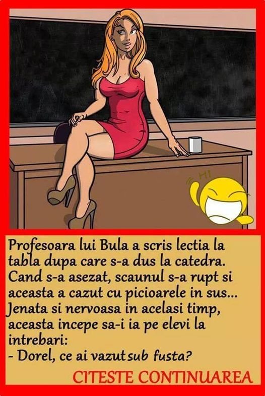 Profesoara lui Bula a scris lectia la tabla dupa care s-a dus la catedra. Cand s-a asezat, scaunul s-a rupt si aceasta a cazut cu picioarele in sus…