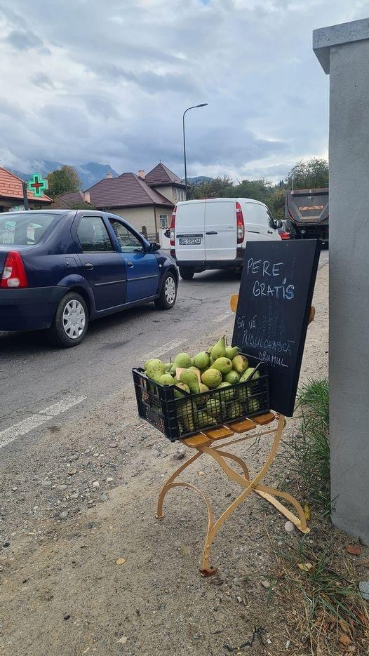 „Se reabiliteaza DN73, drumul care trece prin Bran. Ieri după amiază era o coloană de nedescris, stăteau mașinile zeci de minute fără să miște în fată la Petit Castel. Ca să le îndulcesc drumeților șederea, am scos o lădiță cu pere, din care i-am invitat să se servească GRATIS. Noi ne-am văzut de treabă prin livadă și spre seară când traficul s-a liniștit, m-am dus să strâng – în lădiță nu mai erau pere, ci bancnote de 1, 5 sau 10 lei, in total 62 de lei, lăsați de cei care s au servit și au apreciat gestul.